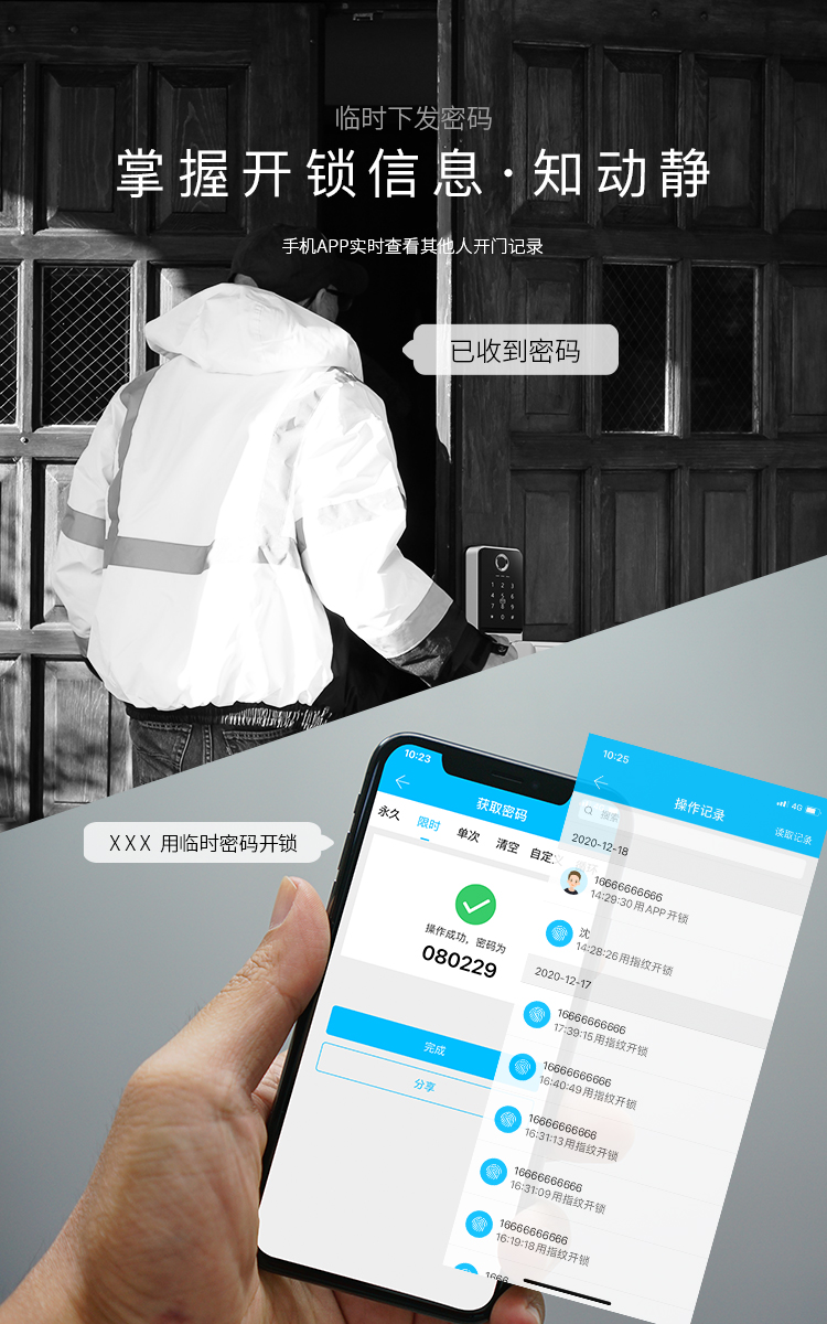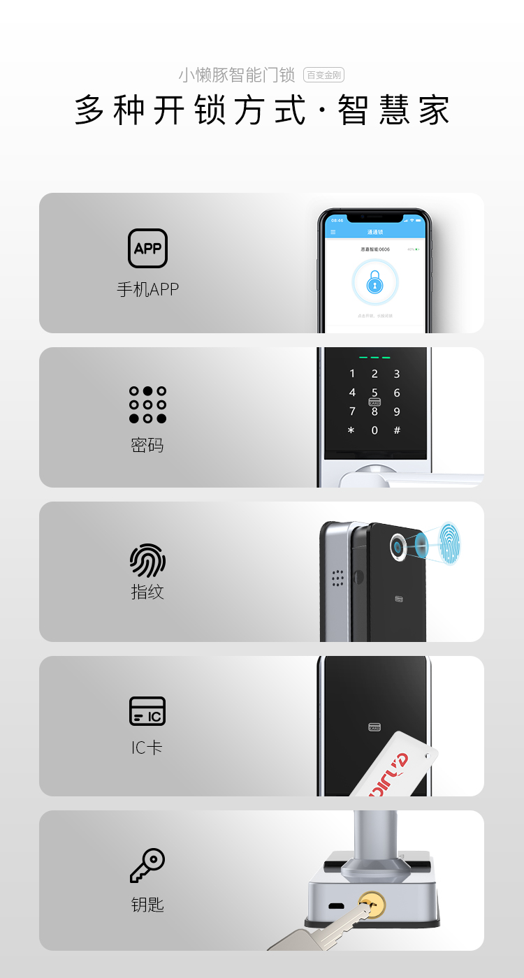 指纹、密码、IC卡、手机APP多种开门方式